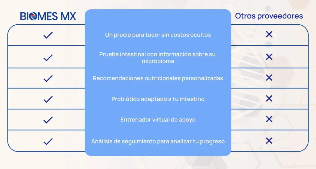 En lugar de sugerencias generales, ofrecemos pautas nutricionales personalizadas basadas en el análisis específico de tu microbioma.